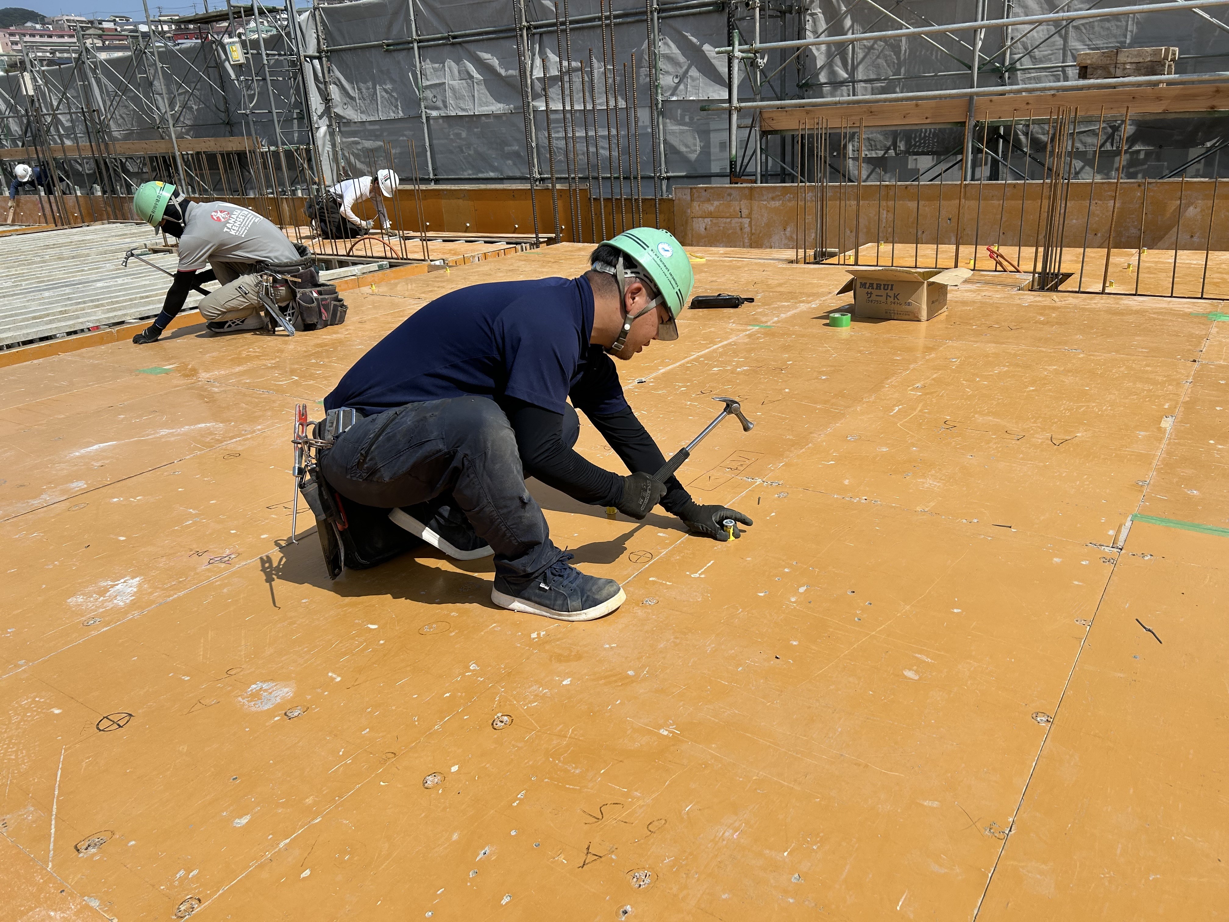 型枠の仕事はやればやる程奥が深く覚えることがたくさんありますが、自分の加工した部材などが現場でうまく納まりかたちになっていく姿は圧巻です。型枠にコンクリートが打設されると頑丈な建物がどんどん大きく高くなっていきこれが何十年先まで残っていく事にやりがいを感じます。